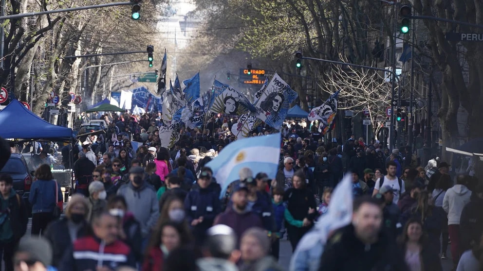 Con banderas, bombos, pancartas y trompetas, se espera una multitudinaria manifestación en frente de la Casa Rosada. El tránsito está totalmente cortado en ambos sentidos de la Avenida 9 de Julio desde el Obelisco hasta avenida San Juan.